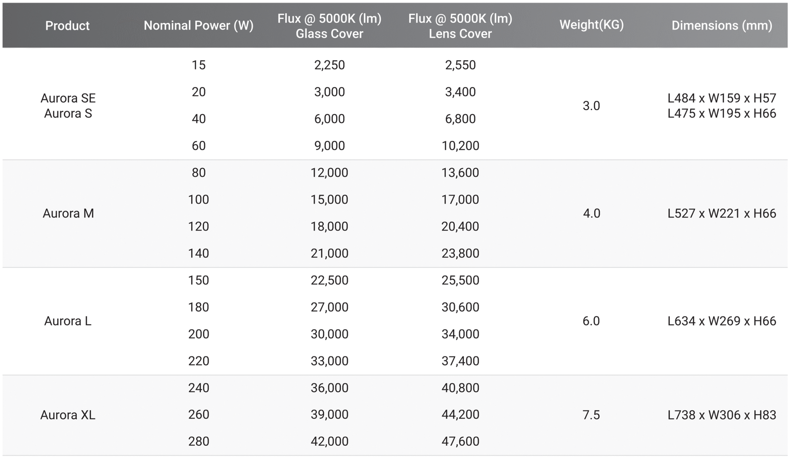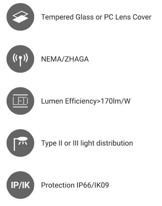 Aurora is a new generation multifunctional street lighting products with glass version and lens ver-sion. There are five size lamp bodies available, SE, S, M, X, XL, covering from 20W to 300W, and two high-efficiency versions available, 160lm/W for the glass version and 170lm/w for lens version, ideal for different project requirements.